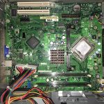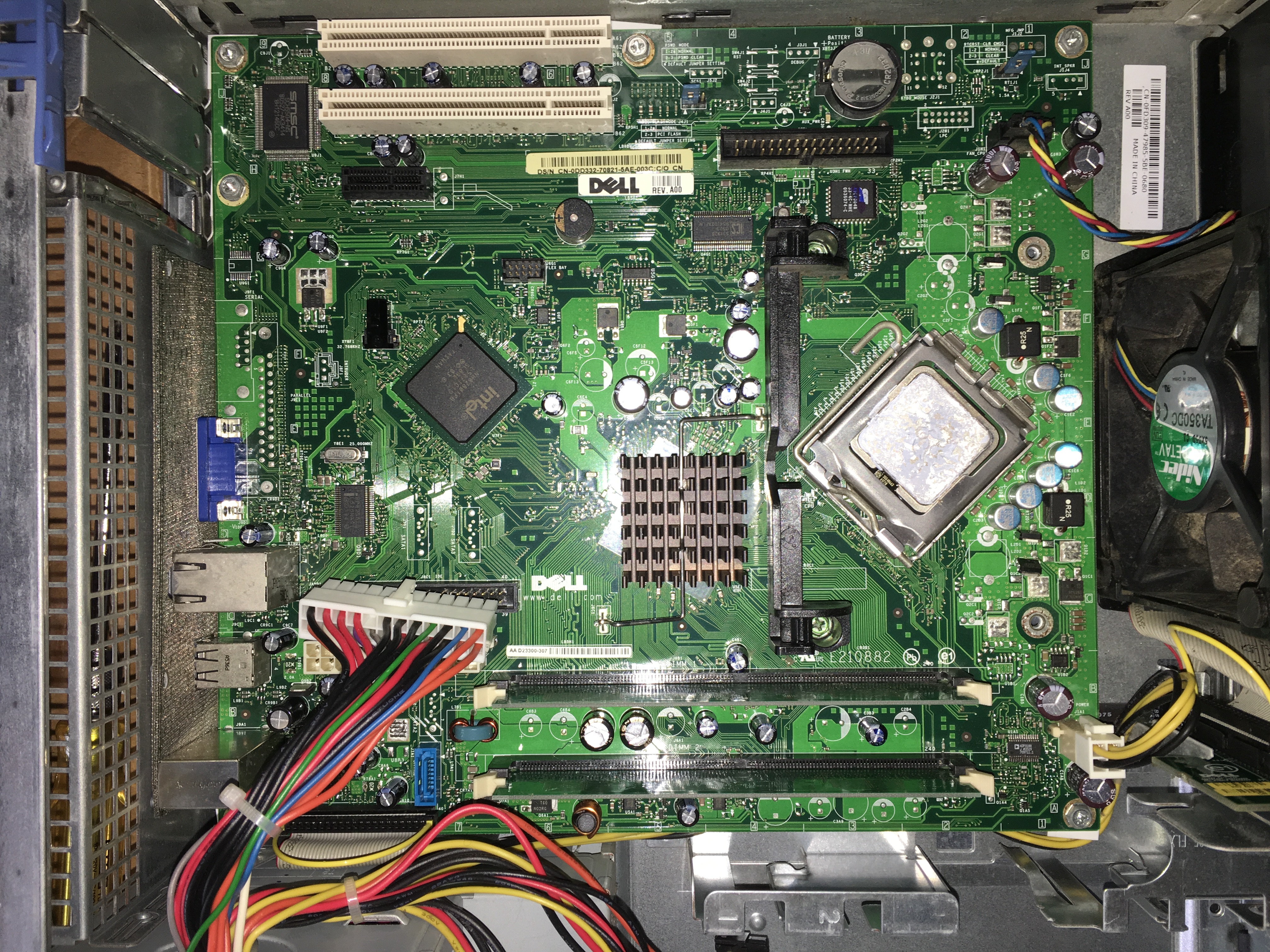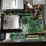 メモリーと、CPUクーラーを外しました。シリコーングリスで白くて見えませんが、CPUはCeleron D 331でした。中央に見えるヒートシンクが915GV Express のようです。仕様書によれば、システムチップセットは915GV Expressで間違い無さそうです。