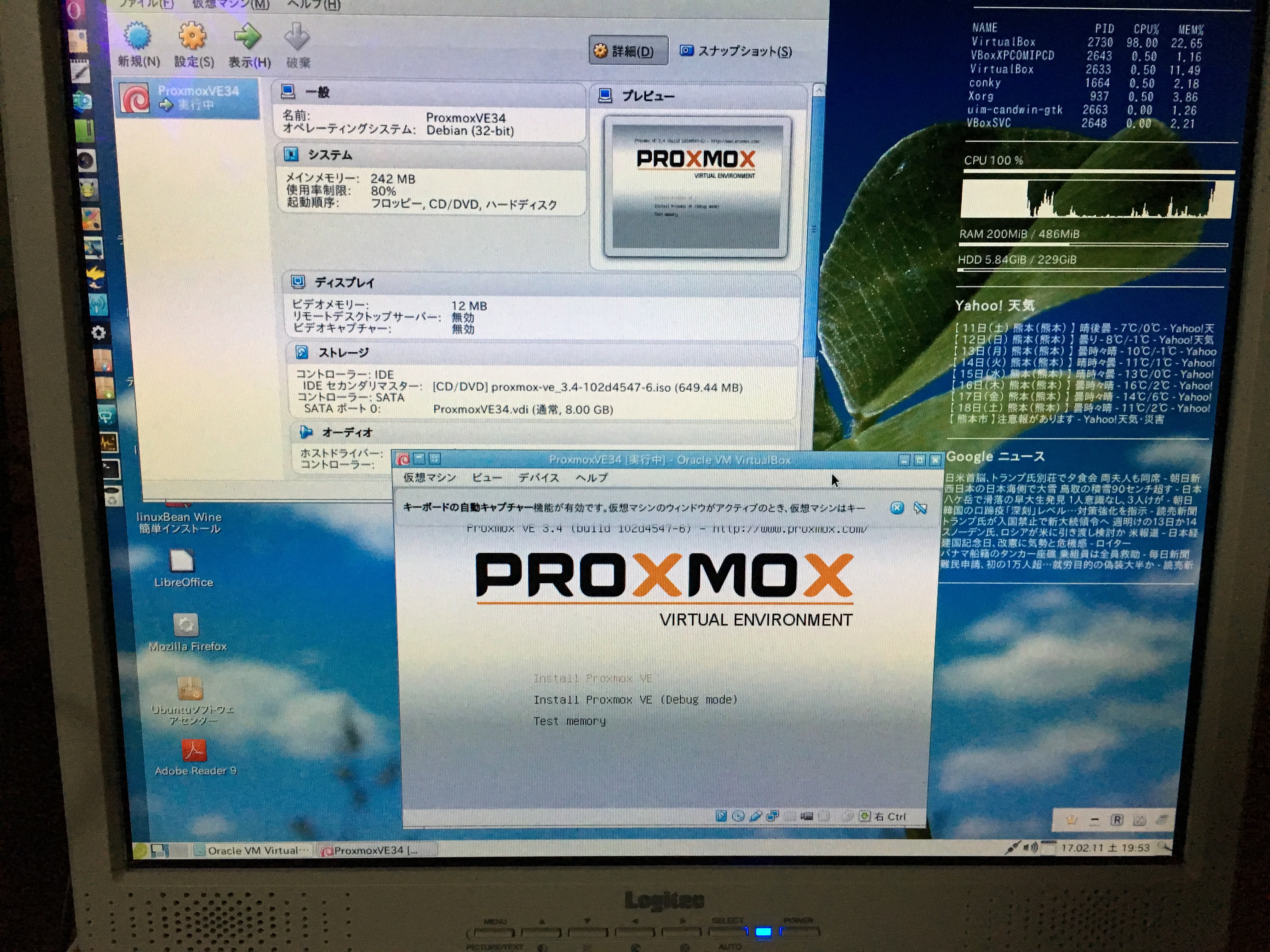 それと、仮想コンピュータにLinuxBeanをインストールする場合、仮想環境側のチューニングがまずいと、動作が不安定になったりしましたが、今回インストールしたパソコンは、そこそこ出荷台数の実績がある、実物のメーカー製パソコンだったからなのか、搭載メモリー512Mと狭い中、沢山のアプリケーションを立ち上げて、CPU使用率100%、スワップも始まりレスポンスも帰って来ない状況になっても、OS自体は安定していて、アプリケーションを一つずつ、終了させると、また元気な状態に復帰した様に思いました。そう言う意味では、上手にチューニング出来ていない仮想環境にくらべれば、案外堅牢性が有るかも知れないなぁと思いました。