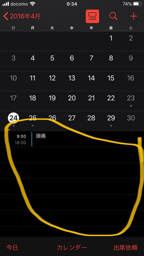 そうしますと、下の写真のように、画面の下半分に、該当の日のスケジュールが表示されました。 この例では、更にここで2016/4/24をタップして、4/24のスケジュールメモが表示された状況です。
