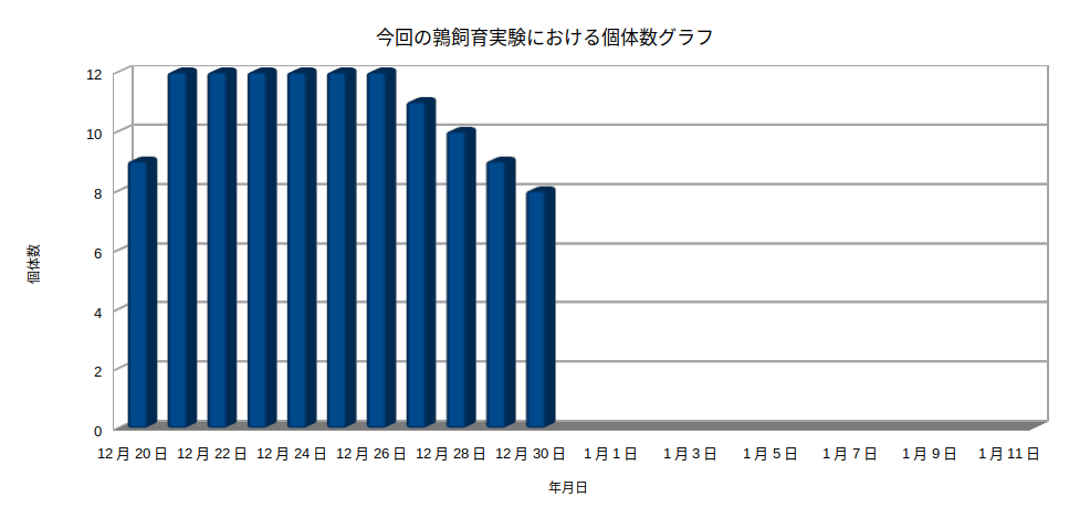 30個の有精卵から孵った12羽は、10日目で8羽になりました。