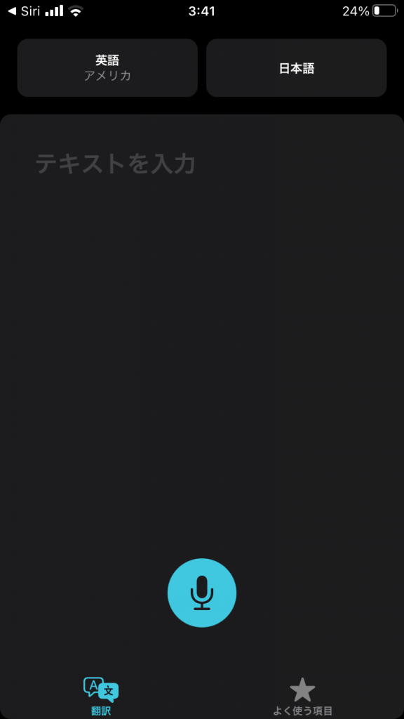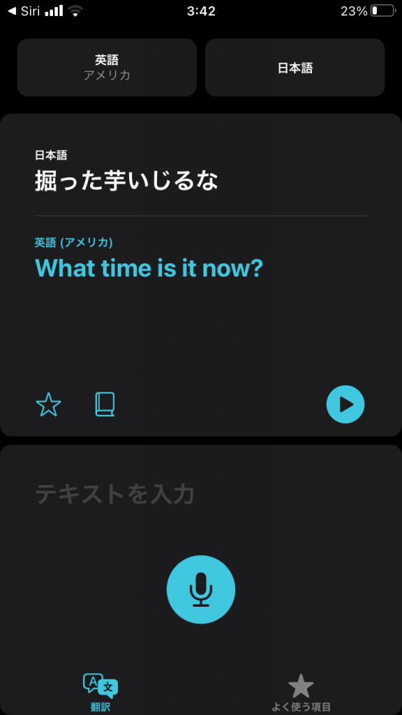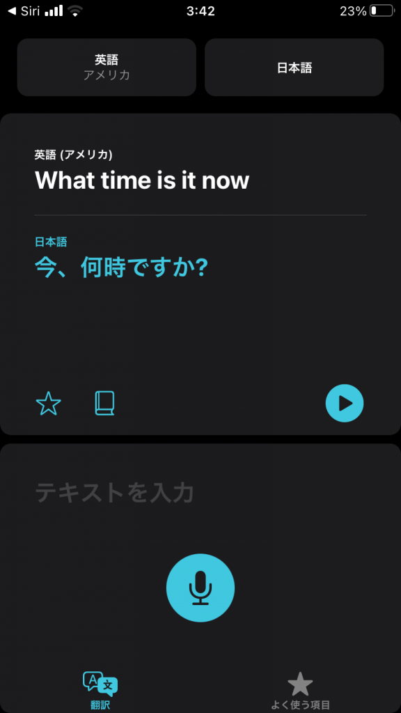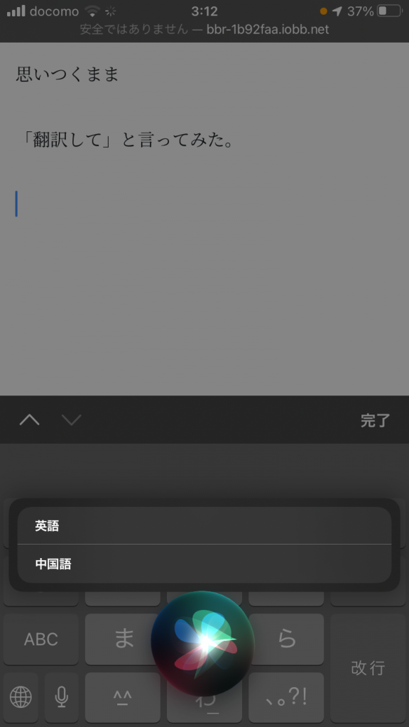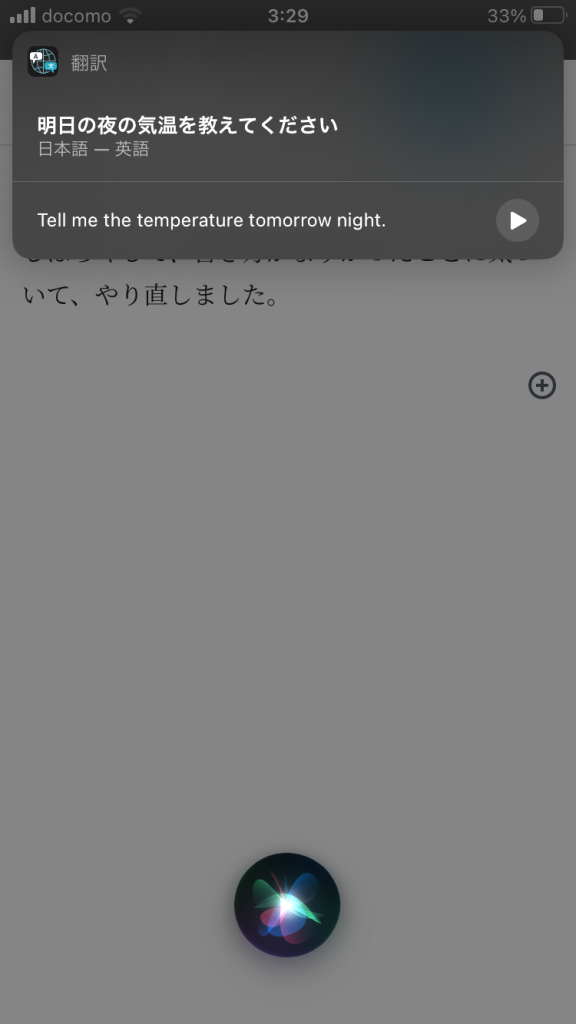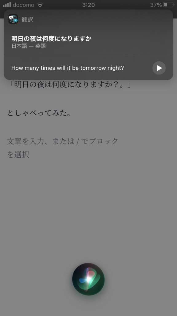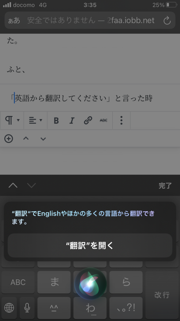 「”翻訳”でEnglishやほかの多くの言語から翻訳できます。」と返事してくれたので、試しに「”翻訳”を開く」をタップしてみた。
