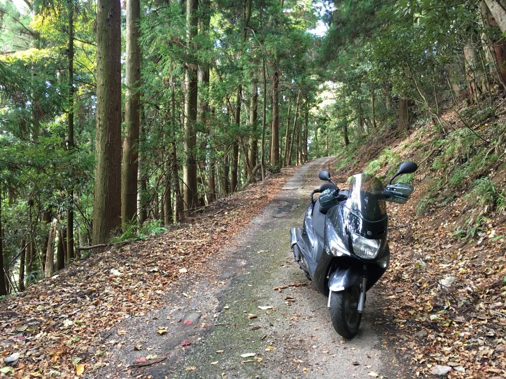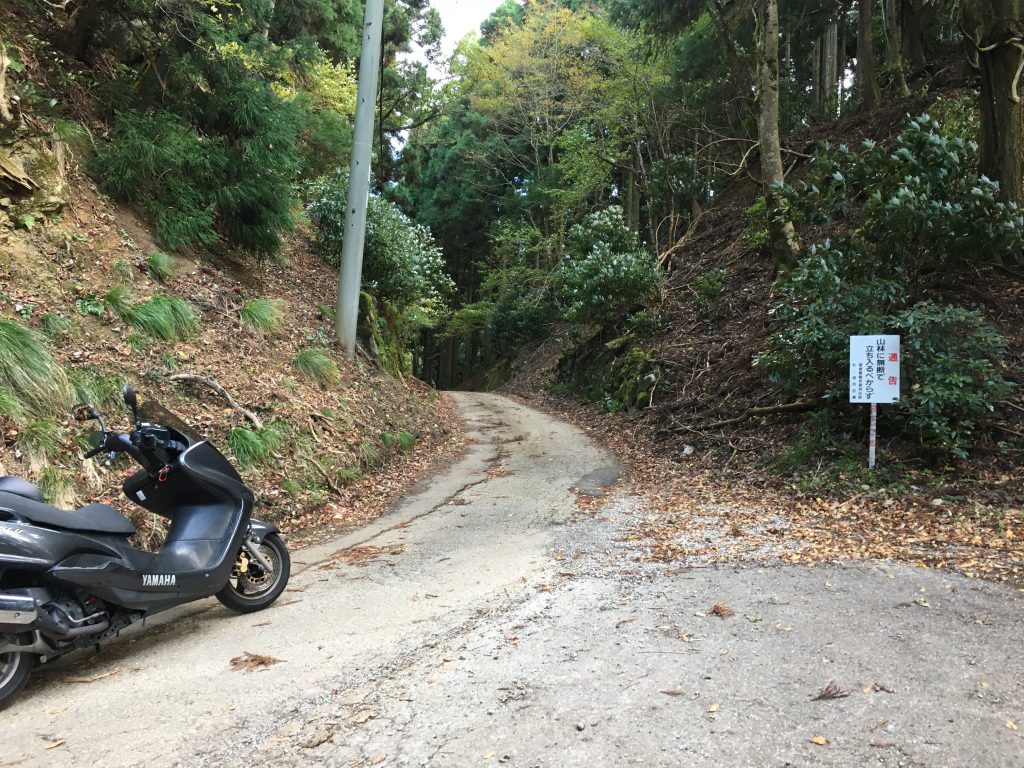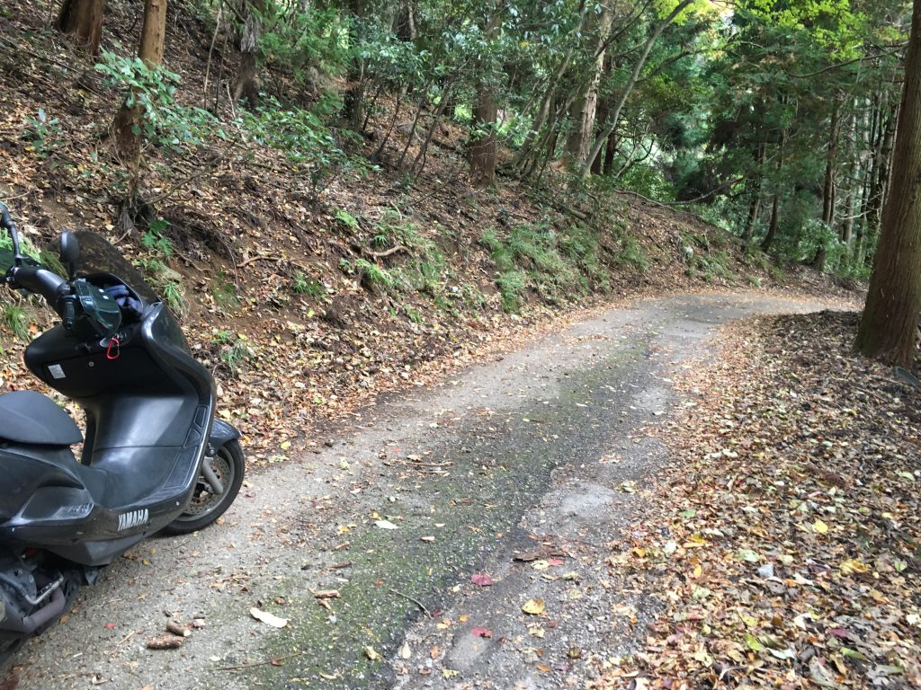細さと、急勾配で、125ccのスクータには、厳しいのですが、苔と落石と小石、散乱した枝は、スクーターの水冷機構に悪影響なのと、ハンドルを取られるとガードレールもない傷んだ路面から外れて飛び出すか崖に当たる危険が有りますので、ほとんど気を抜けないまま、超スロー運転で、御神木付近に辿り付きました。