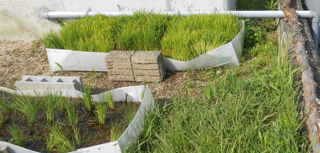 6月頃、中干しと言う作業が有ります。今回の実験では、水を抜くというより、時期が近づいたら保水せず、苗床の表面がやや乾燥する状態に持って行きました。この時期に強風に吹かれると、飛ばされる危険が有りますのでペグなどで補強することも考えておくほうが良いのかも知れません。