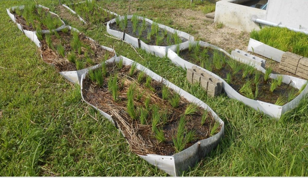 普通の水田と比べて、培地の条件がかなり異なりますので、どのくらいの本数をどのくらいの間隔を開けて植えるのが良いのか?については、実験を重ねるか、同時に幾つも作ってバリエーションを増やし最適な値を探すのが良いと思いますが、場所が確保できればやってみたい事に成ると思います。